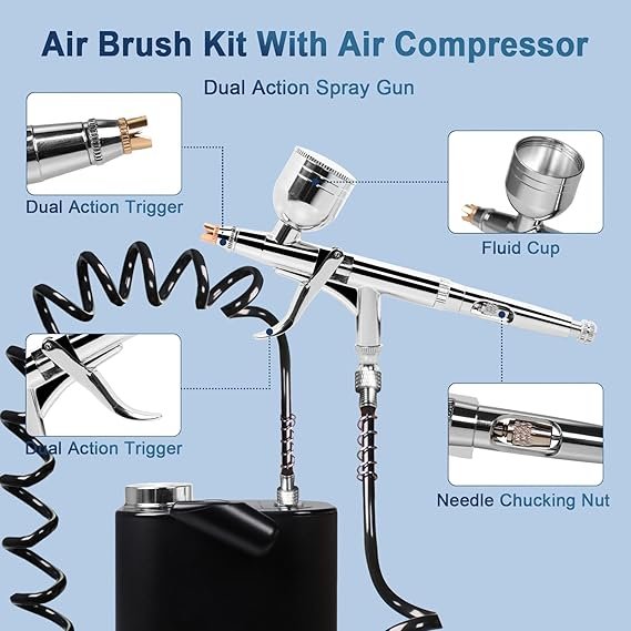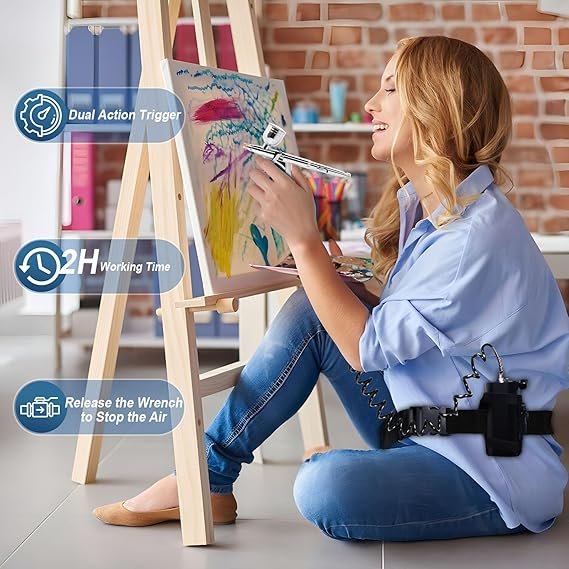 High Pressure (50 PSI): The airbrush kit offers a high-pressure setting of 50 PSI, which can be adjusted as needed. This high pressure is claimed to provide a professional painting experience including painting, model painting, makeup, cake decoration, temporary tattoos, and manicures. Portability: trigger air brush kit with air compressor comes with a belt and an air hose, providing users with the flexibility to move around and perform tasks without being constrained. Comprehensive Kit Contents: The package includes various components such as the airbrush gun, compressor, belt, air hose, wash needles, cleaning brushes, different capacity cups, liquid extraction dropper, adjustment wrench, USB-C charging cable, and a user manual. Performance and Comfort: The airbrush gun is designed to balance spraying performance with an ergonomically designed grip. The pistol trigger design is said to reduce hand fatigue during prolonged use. The kit includes a 0.5mm needle nozzle set and replaceable fluid cups of different capacities to meet various usage needs.