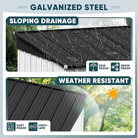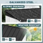 Devoko metal shed is suitable for storing your belongings outdoors. It can store landscaping supplies in the garden, or serve as utility room in the patio or store firewood in the backyard or even a pet house. Keeps your stuff out of the wind, rain and sun.The sloping roof design not only increases the use area, but also prevents rainwater from gathering at the top for a long time, thus protecting the interior items from drying and prolonging their use. And the lockable door can protect your belongings from theft or stop animals from accidentally entering and destroying.Devoko storage shed is made of high-grade metal material, which has waterproof and UV-resistant properties. The thick material structure provides protection for the product’s all-weather use, even in harsh weather conditions.