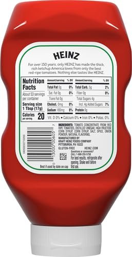 Heinz Tomato Ketchup is made only from sweet, juicy, red ripe tomatoes for the signature thick and rich taste of Americas Favorite Ketchup. Did you know that every tomato in every bottle of Heinz Ketchup is grown from Heinz seeds? Grown not made… One reason why nothing else tastes like Heinz! The thick texture makes our ketchup perfect as a topping or for dipping. It’s gluten free and great for those keeping Kosher to fit your preferences. Reach for our ketchup at every cookout to top your favorite burgers, hot dogs and fries. Packed in 32-ounce ketchup bottles for easy sharing, this condiment is your go-to option for gatherings and everyday meals.